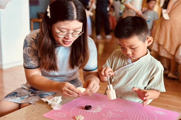 活动从别开生面的“朱砂启智”签到仪式开始,现场设置了亲子共舞、书法体验、国画体验、猜灯谜、做灯笼、折玉兔、套圈、做月饼、打糍粑、尝桂花酿等环节。活动中,老师们通过各种形式向小朋友们讲述中秋节的由来、传说、风俗等。