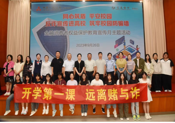 9月26日下午,交通银行泰州分行联合人民银行泰州市分行、泰州市公安局海陵分局,在泰州学院举办“同心筑盾平安校园”教育宣传月集中宣传日反诈主题活动。泰州学院美术学院全体新生近300人参加活动。