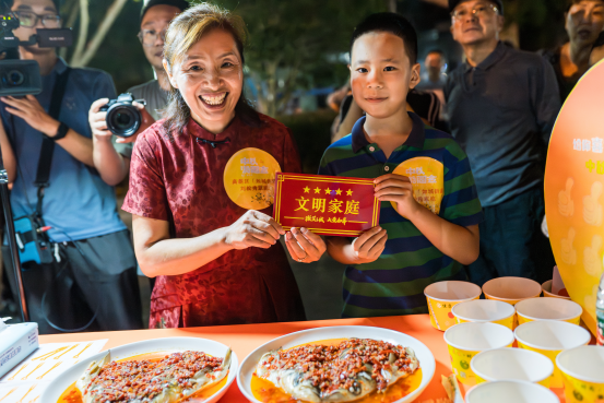 在“家·味道”主题区,10户如皋市级文明家庭联袂带来各自家庭的拿手菜,“五谷丰登”“人月团圆”……一道道寓意美好的“如皋味道”组成了丰盛的中秋宴席,大家纷纷驻足,共享“家的味道”。从如皋市文明委领导手中接过五星级文明家庭铭牌后,夏素琴向大家讲述了家风故事,分享了自家的幸福密码,“我们夫妻俩觉得,幸福就是要相互体谅、相互关照、相互尊重,希望今天的10对新人在以后的日子里互敬互爱,相濡以沫,携手前行!”