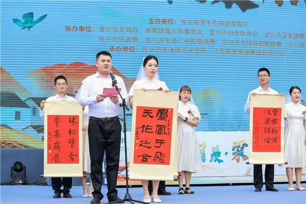 琴瑟和鸣五十载,传承宜兴好家风。现场为十对模范金婚夫妇举行了颁奖仪式。新婚夫妇为金婚夫妇献花,金婚夫妇回赠书法祝福。新老传承,让爱延续。