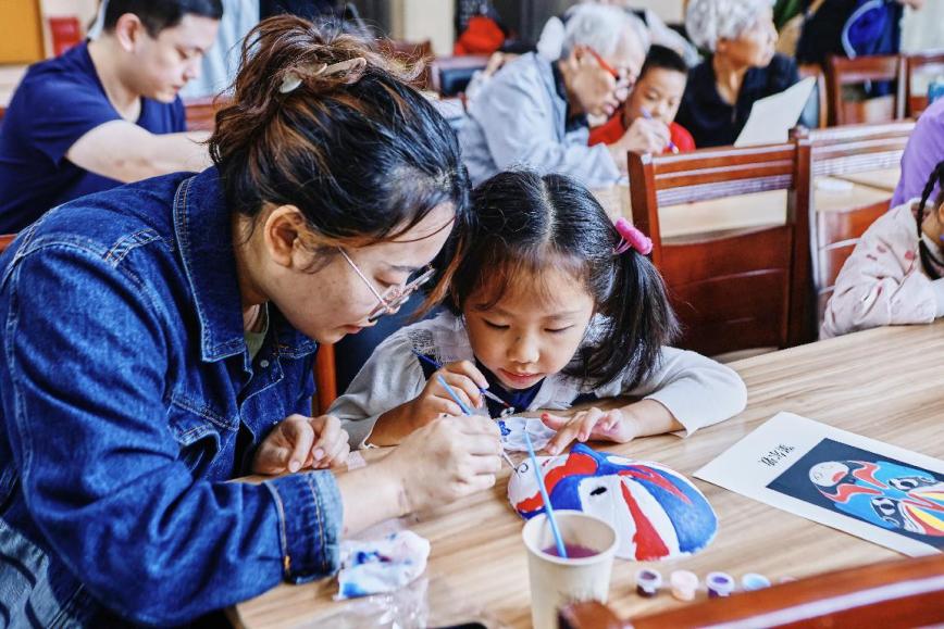 扎灯彩、做剪纸、绘脸谱、投壶猜谜、绘制创意非遗卷轴……亲子活动中,各具特色的传统文化体验让参与家庭充分享受闲暇之余的亲子欢乐时光。灯彩是中国传统节日文化中非常重要的一部分。在秦淮灯彩市级传承人曹红老师的指导下,家长和小朋友们利用绸布和纸共同制作小兔子灯。戏剧脸谱是中国戏曲表演中一种独特的艺术形式,在老师的指导下,孩子们从孙悟空、关羽、窦尔敦这三个经典的脸谱形象中选择一种进行绘制。制作完成后,孩子们仍意犹未尽,带着自己亲手绘制的脸谱,一边凹造型,一边唱着“蓝脸的窦尔敦盗御马,红脸的关公战长沙”。
