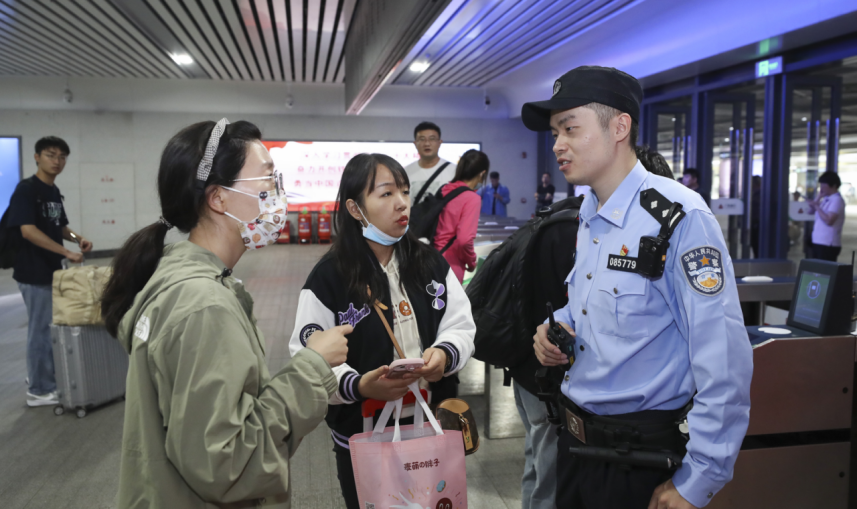 民警正在出站口开展安全巡查