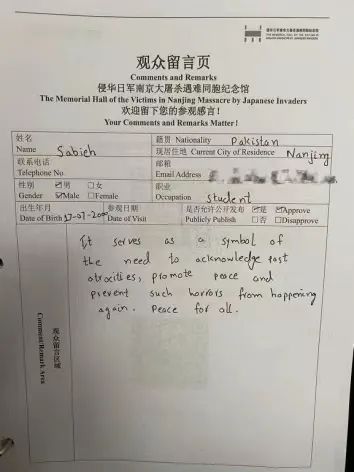 巴基斯坦小伙Sabieh在参观后,在“南京大屠杀史实展”尾厅的留言簿上写道,纪念馆是人们必须承认发生过暴行的象征,它能提醒人们和平的重要性并防止再次发生暴行。(报道员:窦心蕊 徐红霞)