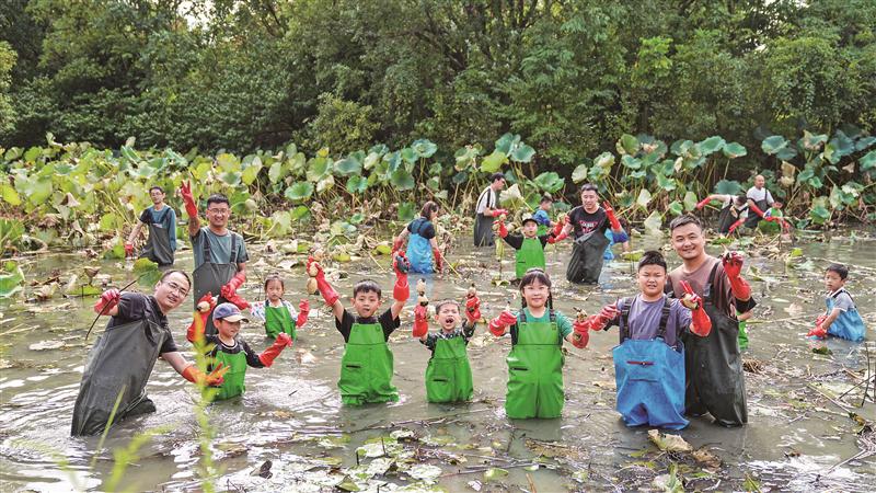 市民在羊尖乡村荷塘体验采藕。(刘芳辉 摄)
