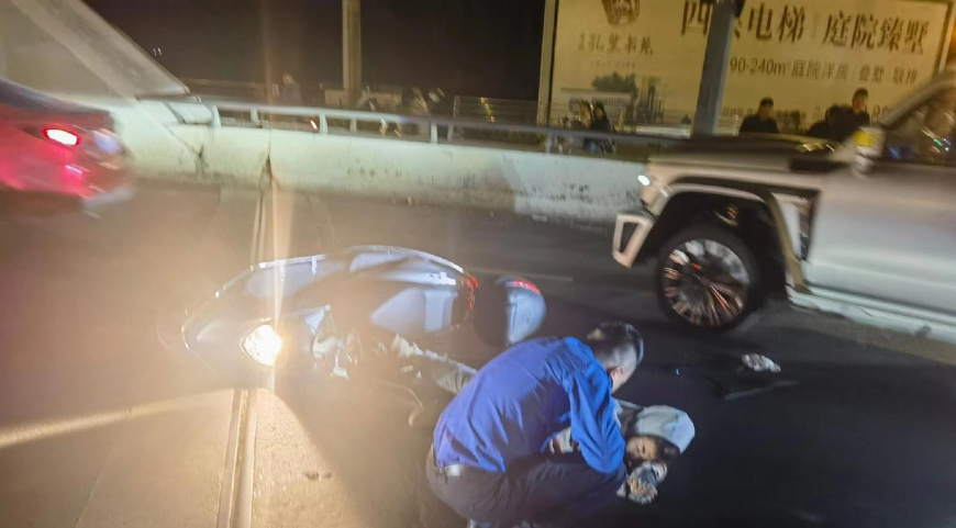 10月8日晚18时20分,连云港市城管海州二大队执法人员日常巡查至秦东门大桥时,发现西盐河路上一辆左拐摩托车与对向一辆右拐商务车在路口处发生碰撞,事故现场,摩托车被撞飞数十米,摩托车驾驶人摔倒在地,不能动弹。