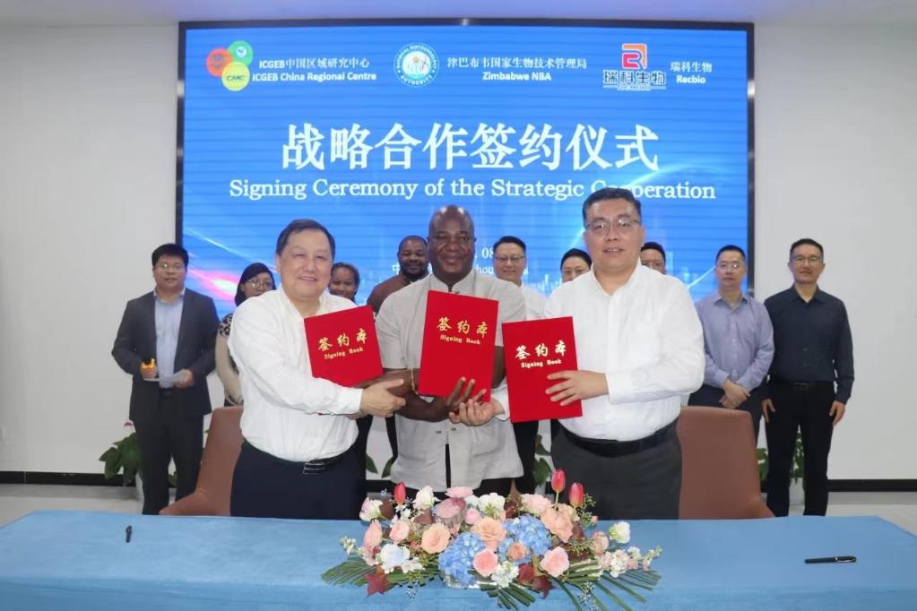 新华网南京10月12日电(记者陈席元)近日,津巴布韦国家生物技术管理局同国际遗传工程和生物技术中心中国区域研究中心、江苏瑞科生物技术股份有限公司在江苏泰州中国医药城签署合作备忘录,计划在疫苗等领域开展专业技术培训、临床试验、生产等合作。