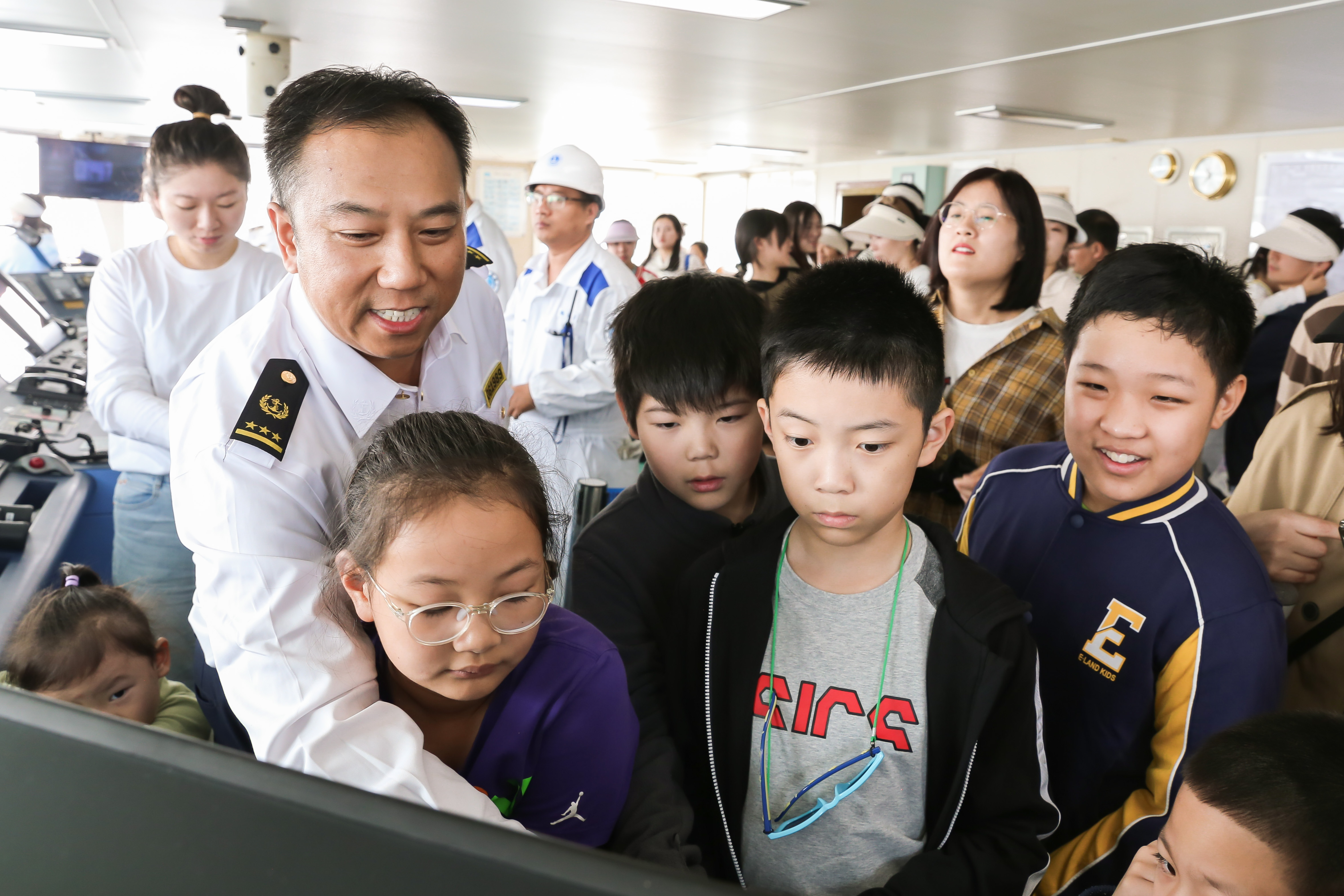活动过程中,大家共同参观了国家级海上溢油应急设备库,海事人员结合典型案例,现场展示部分溢油应急设备的用法用途,号召大家一起保护海洋环境,同时开展海上救援演示、水上交通安全知识宣教,利用各种救生工具进行防溺水知识互动体验,提升广大中小学生和家长对水上交通安全的关注度,预防溺水事故发生。随后,大家分批次有序登上航标运维船、海事巡逻船和海上救援船等多种公务船艇,参观船舶驾驶台、机舱、船员生活区等场所,认识了解雷达、电子海图、船载AIS自动识别系统等船艇主要设备和船舶航行知识。海事志愿者通过现场演示、有奖问答等方式,讲解了救生衣的穿戴、灭火器的使用、乘船基本安全知识和救生基本方法,提高大家的水上安全意识。大家还一起随船巡航了港口海域,深度体验航海魅力。