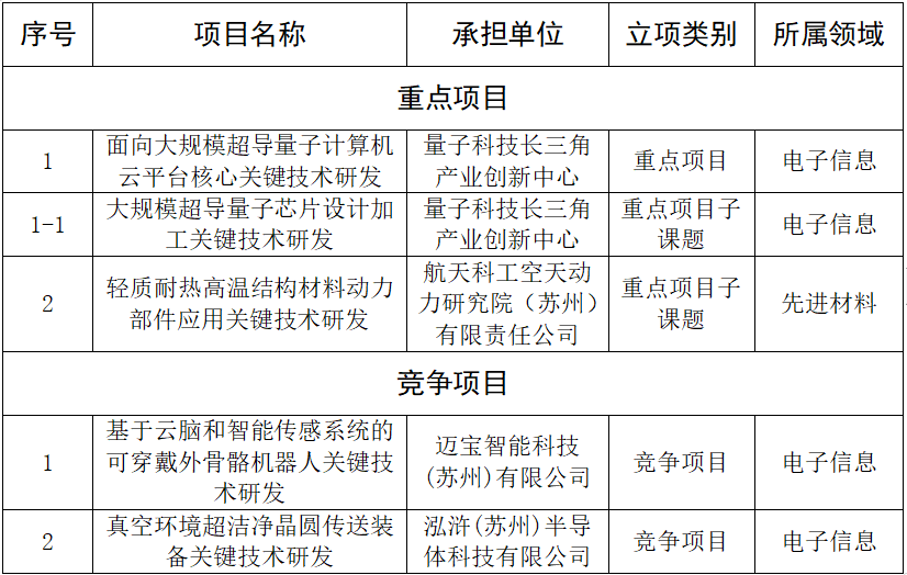 本次立项,从立项类别上看,重点项目主课题项目苏州市共立项1项,由来自相城区的量子科技长三角产业创新中心获得,获得省级资金1200万元。此外,相城有2个子课题获得立项。竞争项目苏州市立项共13项,其中,相城区立项2项,获省资助经费400万元。从产业领域看,5个项目主要集中在电子信息和先进材料两大产业领域,重点涉及量子计算、半导体封装设备、半导体材料、智能机器人等领域开展前瞻性和关键性技术的研发。