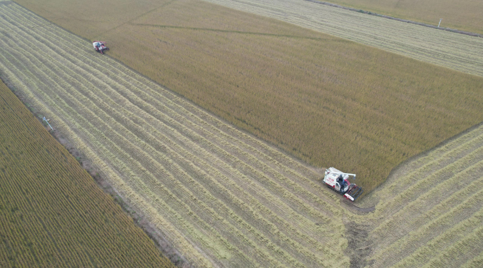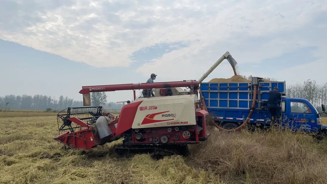 一簇簇沉甸甸、金灿灿的稻穗铺满了稻田,成熟的稻穗迎风摆动,收割机徐徐向前,割台翻滚,一片片水稻被斩断,经脱粒后存储在收割机的粮仓。收割机内稻谷满仓后,通过自动化管道将稻谷直接输送到机耕路旁的货车上,收割运输过程快捷高效、一气呵成。