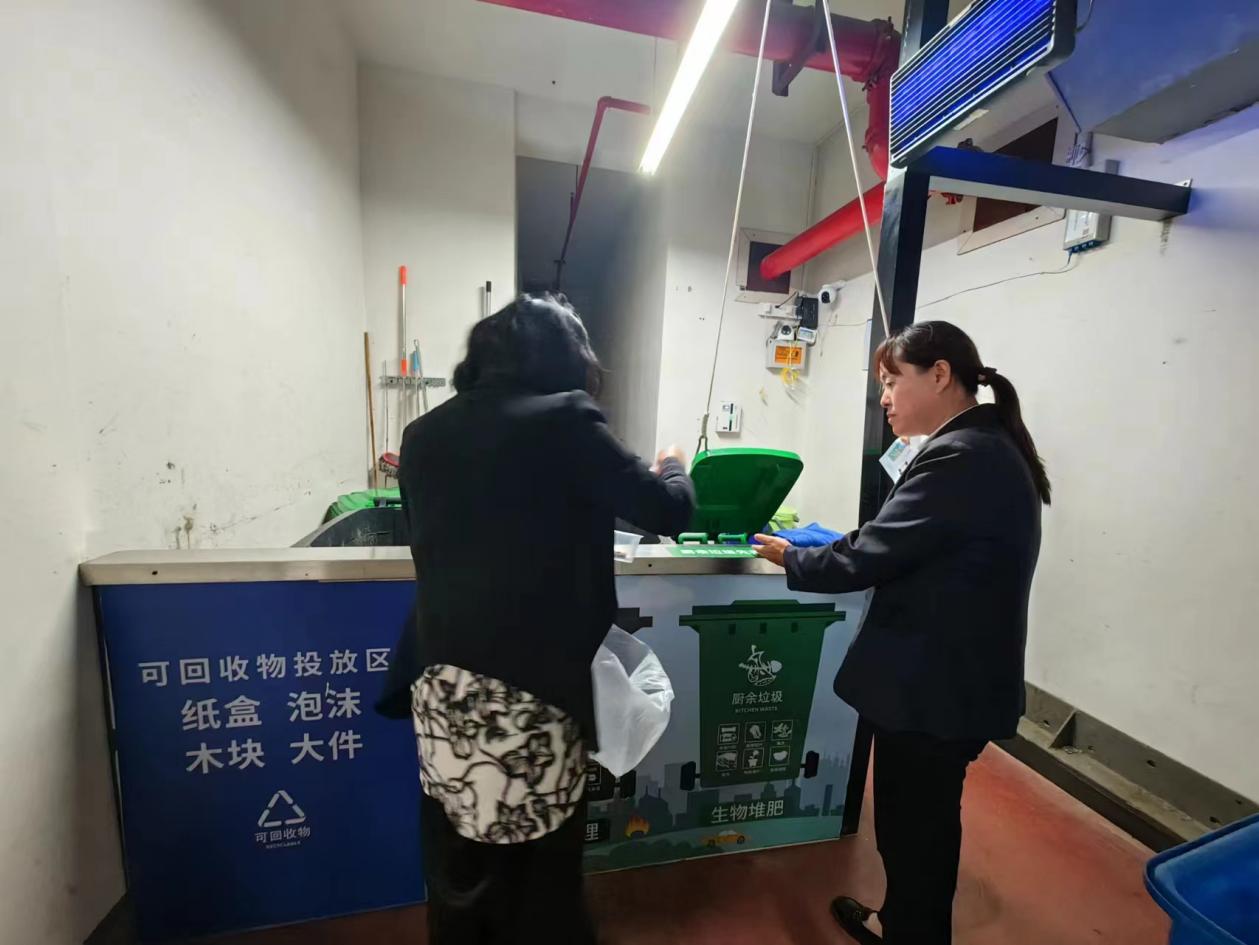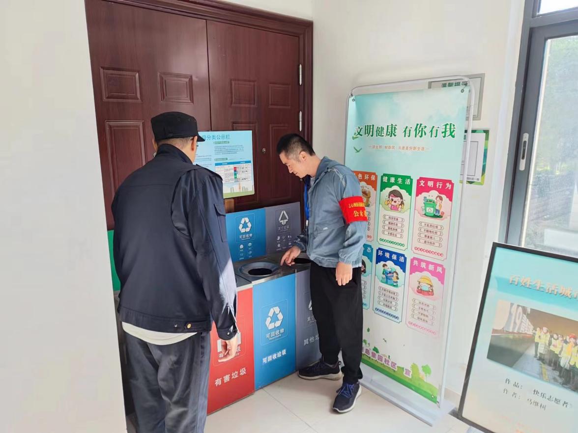 活动中,垃圾分类志愿者、城市治理公众委员们来到小区垃圾分类收集点,用桶边“面对面”的形式,“手把手”教居民精准投放。