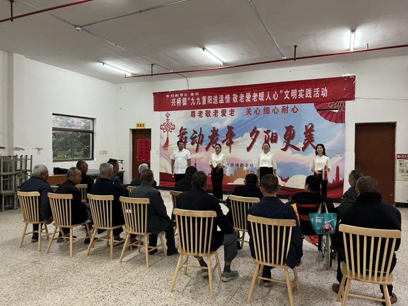 文娱送关怀,孝老情意浓。兴桥镇新时代文明实践所组织敬老院的老人欢聚一堂,共庆佳节。镇文化文艺志愿服务队为老人们带来了节目《移风易俗三句半》,内容通俗易懂且富有趣味性,他们围坐在舞台前,一边品尝美味的佳肴,一边观看精彩的文艺节目,老人们纷纷拍手叫好,精彩的表演与温馨的画面交相辉映,在敲锣打鼓中书写出最和谐的节日篇章,让老年人切实享受老有所养、老有所乐的幸福感、获得感、归属感。