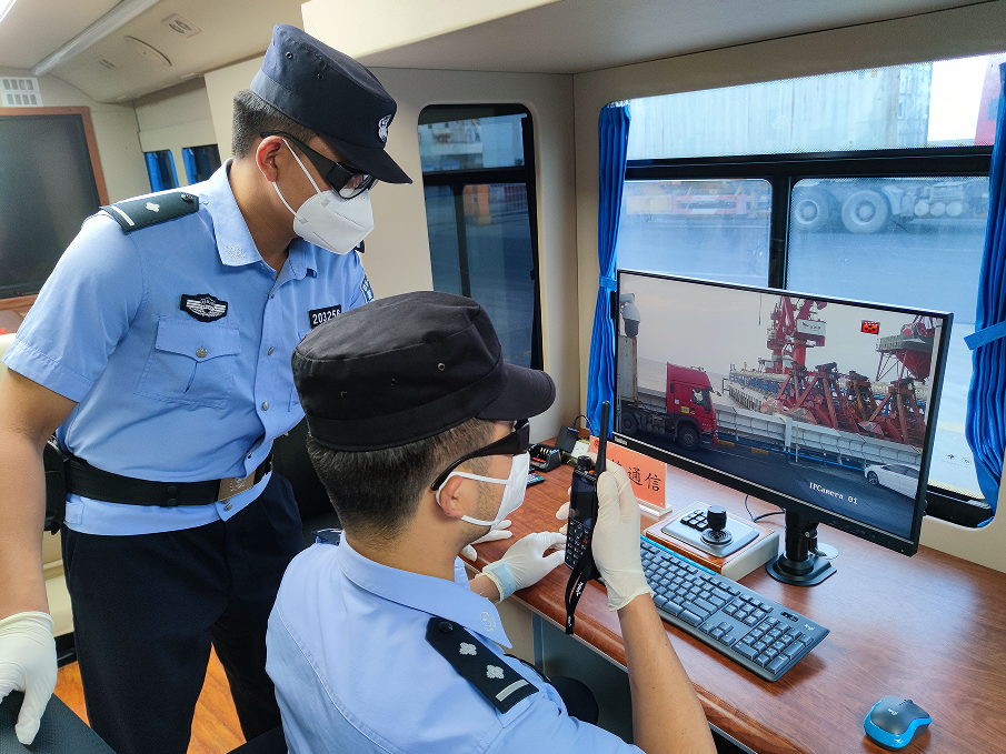 移民警察利用移动警务室监管码头作业现场
