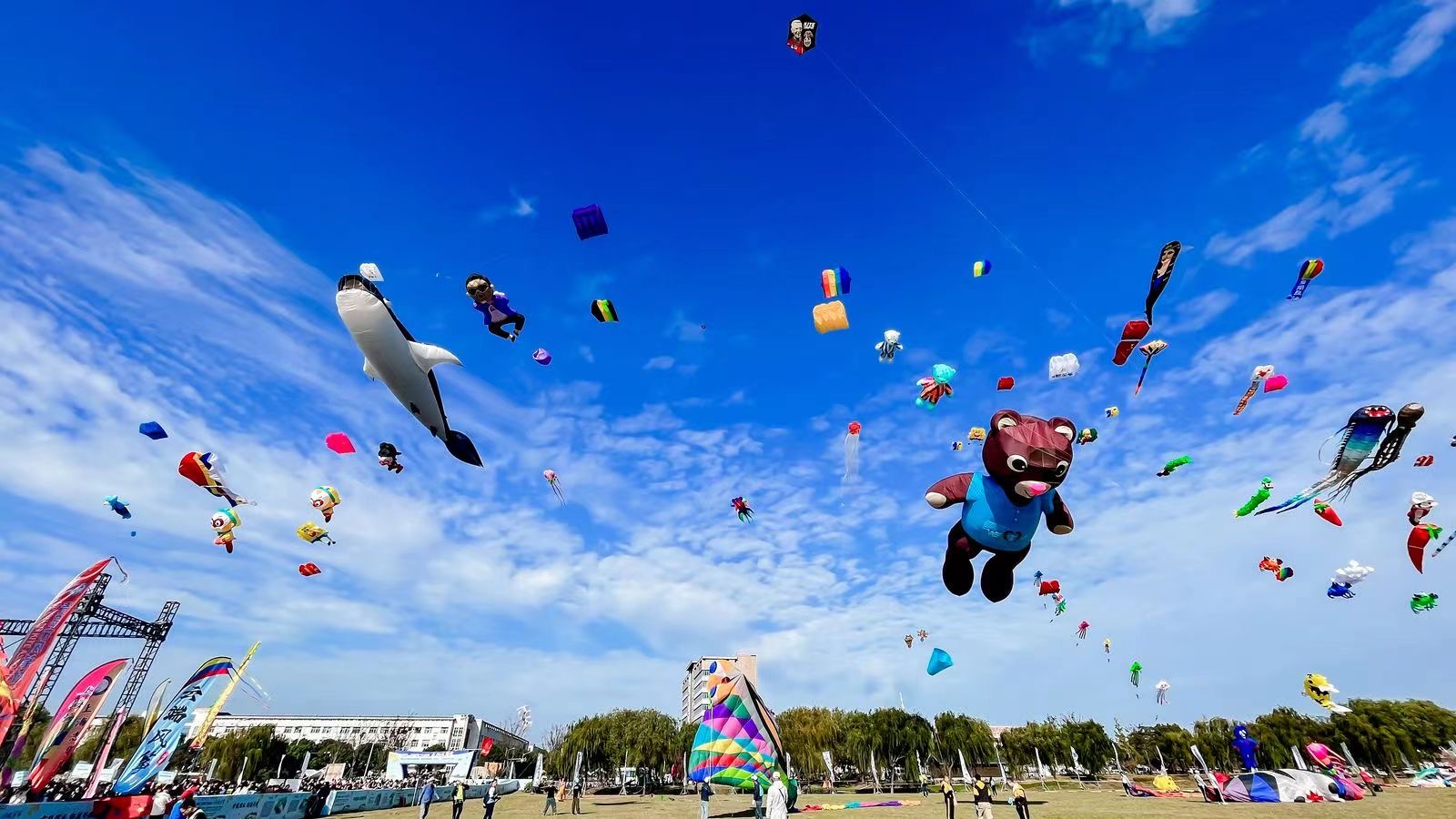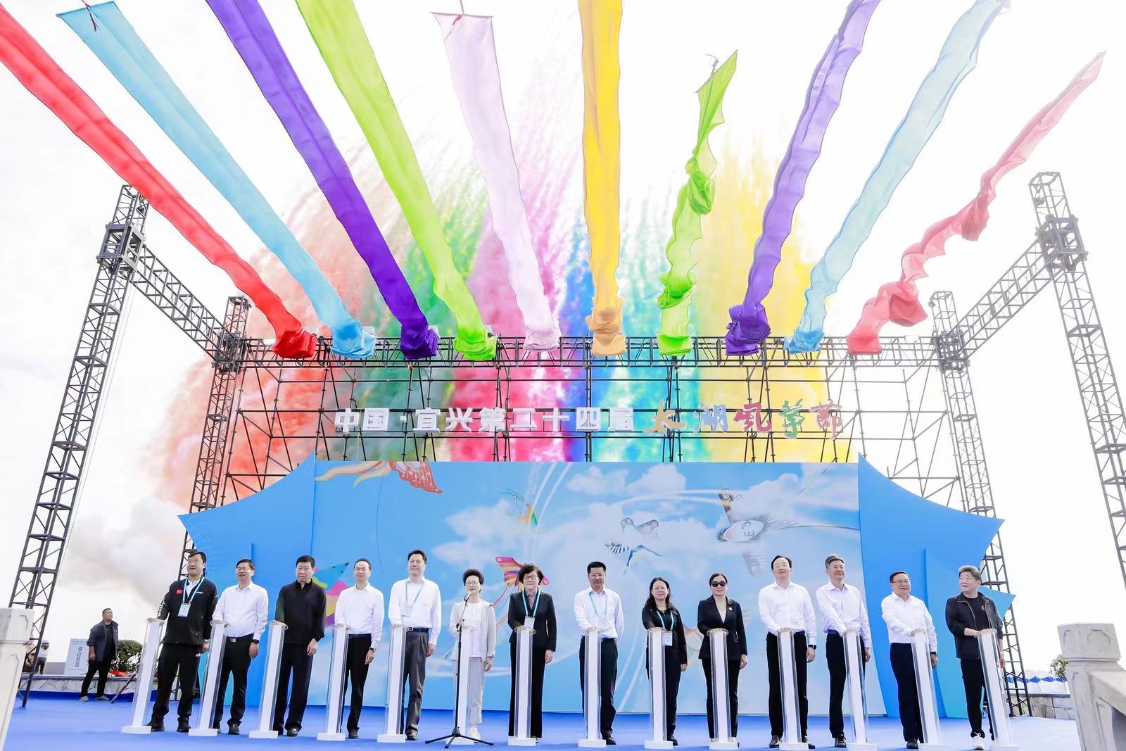 10月28日,中国·宜兴第二十四届太湖风筝节暨2023年国际风筝邀请赛、全国风筝精英赛(宜兴站)、江苏省风筝公开赛在江苏省太湖风筝基地——周铁镇竺山湖湿地公园开幕。来自国内外44支代表队、近300名风筝高手齐聚宜兴、同台竞技。中国风筝协会主席刘北剑,江苏省体育局副局长张海涛,宜兴市委副书记、政法委书记沈晓红等领导出席开幕式。