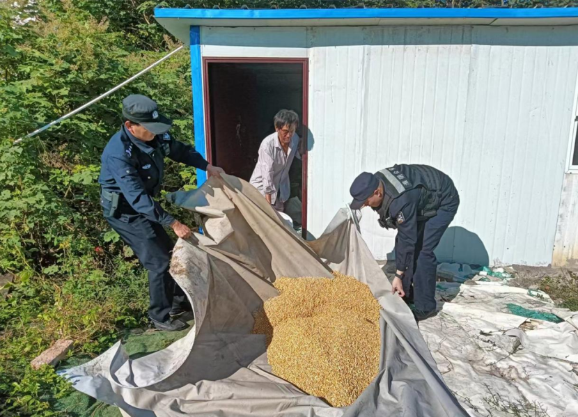 原来在10月23日下午,家住淮安市淮阴区新渡街道的李某因为前不久骑电动车跌倒腿和一条胳膊不慎骨折,女儿喊他去家休中养,但是门口晒着的稻子是他的心病,他想走前一定要将稻子收回家,不然放在门外刮风下雨不安全。在其坚持拖着受伤的身体慢慢收稻子途中,处警返程途中看到老人在艰难收着玉米的张警官,连忙下车上前询问:“老师傅,我看你手脚也不方便,家里人呢?”一边帮忙,一边询问李某家中情况。