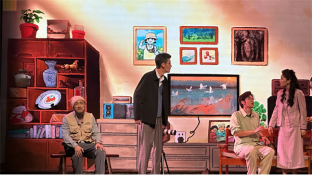 竹林大饭店中庭大厅内座无虚席、气氛热烈。《我不是菜鸟》借助竹林大饭店内真实呈现的老盐城场景,以盐城一家三代人“打鸟、护鸟、画鸟”的故事,向观众们展现了盐城发展的时代变迁和社会进步。丹顶鹤、黑嘴鸥、勺嘴鹬……黄海湿地精灵们相继登场,让观众们切身感受到生态文明建设的成果。全剧主题鲜明、立意新颖,跌宕起伏、引人入胜,黄海湿地守护员们以戏剧的形式,与群众近距离相见,产生心灵碰撞。一个半小时的演出中,一个个生动鲜活的人物形象,一幕幕催人泪下的动人故事,引发了现场观众强烈的情感共鸣。