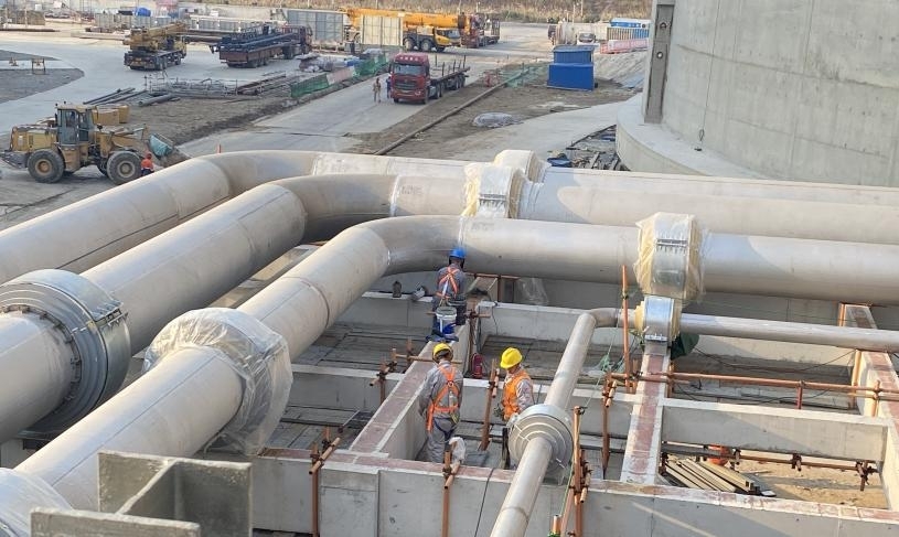 本次施工的罐区管廊工艺管道衔接一期工程预留口,横跨一期扩建工程储罐三个标段,连接6座储罐及其配套设备设施。管道总长8.3千米、最大口径为46吋、焊接总量约3.1万吋口,管道介质类型涵盖液化天然气、天然气、氮气、仪表风等6种类型。