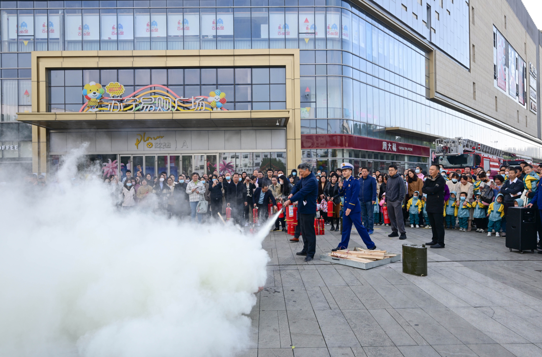 在苏宁易购广场,消防救援人员向市民讲解消防器材功能