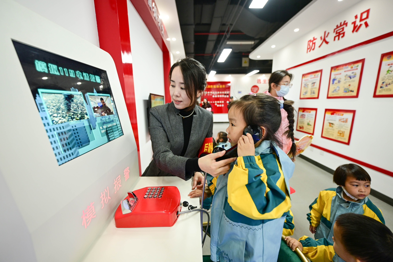 在江苏省淮安市金湖县苏宁易购消防科普体验馆,工作人员指导小朋友模拟拨打火警电话