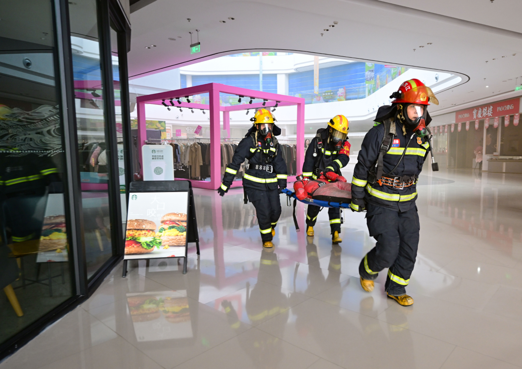 在苏宁易购广场,消防救援人员模拟伤员救援演练