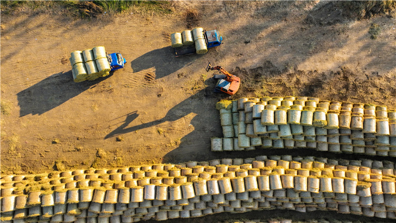 在灌南县孟兴庄镇秋收现场,一台台搂草机在收割完的稻田里快速奔跑,一行行稻草被快速搂成一陇。紧随其后的秸秆打包机,也铆足了劲儿吐出一个个大大的草捆,随后,这些草捆将被装车后,快速驶出稻田。(王玥 报道员:孙荪 殷开军)