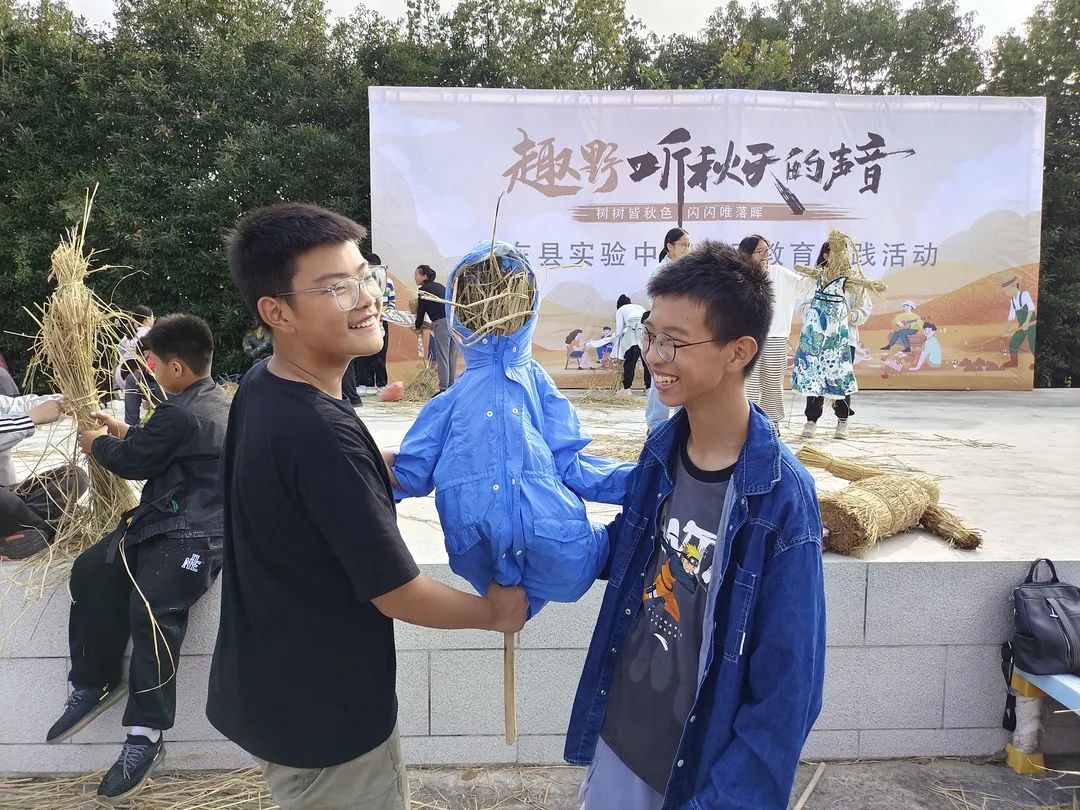 当天下午,同学们在广场上扎稻草人,经历了各种困难各种笑闹之后,终于有个人样了,有的小组还给稻草人配上小裙子,有的还特地扎了两个俏皮的小辫子,充满了童趣。