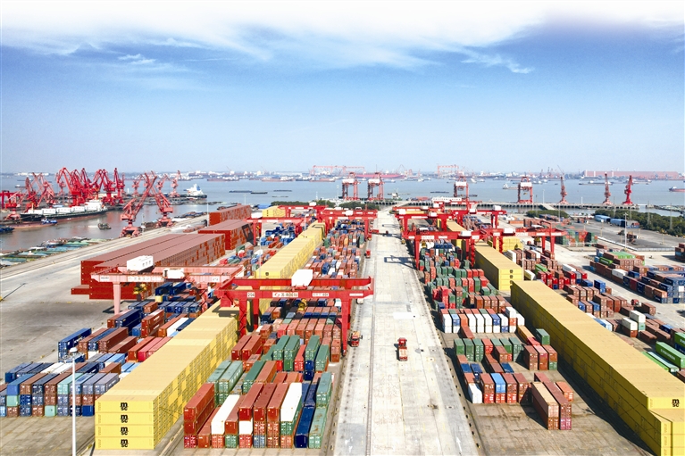 今年1-10月,江阴港完成货物吞吐量3.10亿吨,同比增长7.52%,完成集装箱吞吐量46.88万标箱,同比增长5.22%。图为昨天上午,在江阴苏南国际集装箱码头,运输车辆来回穿梭,一艘艘货船在泊位上有序装卸货物,一派繁忙景象。(陈奇 丁家骏)