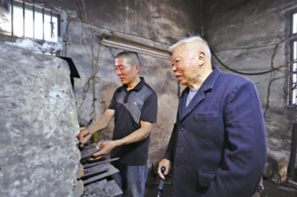 随着传统的铁制农具渐渐被机械化农具所取代,许多生活用具也是机械化生产,手工打制铁具的人也越来越少,但刘荣初、刘春涛父子俩接力传承打铁技艺59年,让打铁声依旧清脆。(赵松)