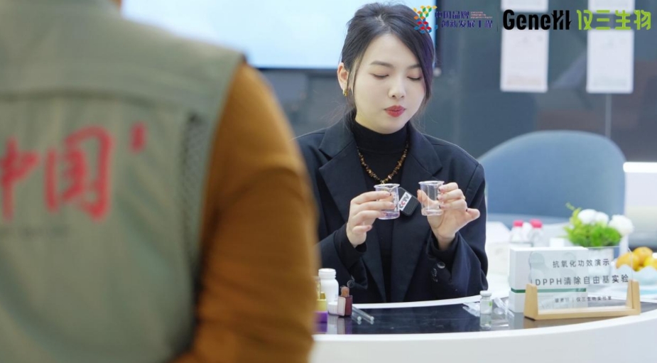 《品质中国》拍摄现场,仅三生物工作人员在CCTV镜头下,现场演示了DPPH清除自由基实验,以“眼见为实”的方式,展示了玻麦妍·麦角硫因精华的超强抗氧化能力。实验结果显示,因为真正做到了“麦角硫因足量添加”,玻麦妍的抗氧化效果远超售价4位数的国际高奢品牌精华。