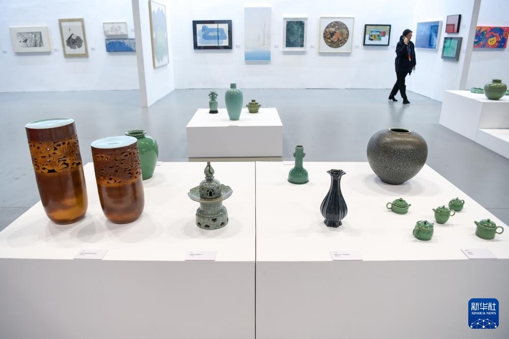 11月14日,参会嘉宾在2023两岸企业家峰会10周年年会海峡两岸青年当代艺术与文化创意展参观。