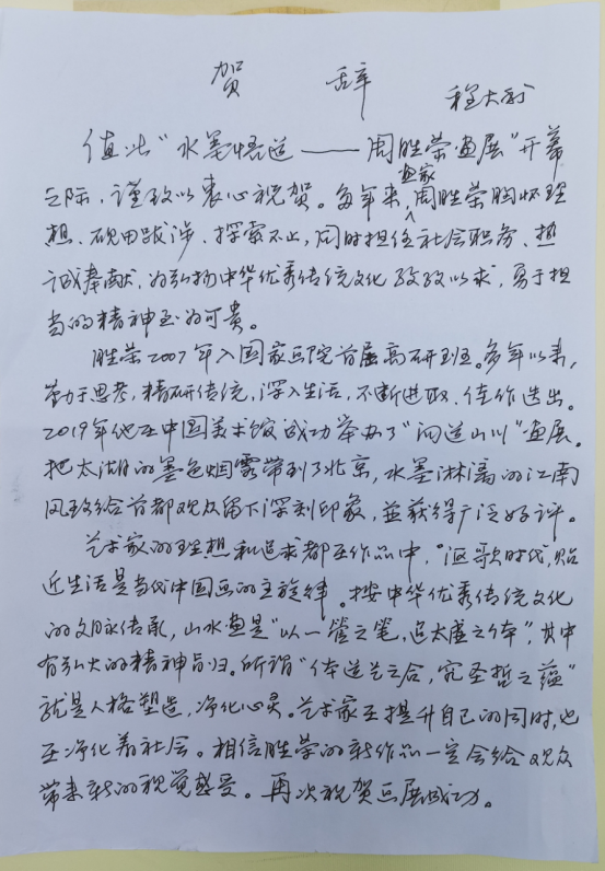 欣闻周胜荣举办个展,他的两位老师——中国画学会创会副会长、中央文史馆馆员程大利,国家一级美术师、无锡市美协顾问杨雨青专门为本次画展写来了贺词。