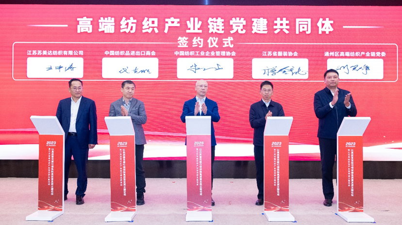 活动现场,“高端纺织产业链党建共同体”正式签约,首批成员既有中国纺织工业企业管理协会、中国纺织品进出口商会、江苏省服装协会、江苏省纺织工业协会、浙江省纺织行业协会、安徽省纺织行业协会、南通市通州家纺行业协会等行业协会代表,又有江苏苏美达纺织有限公司、江苏苏豪纺织集团有限公司等行业龙头。