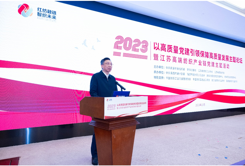 11月19日,以高质量党建引领保障高质量发展主题论坛暨江苏高端纺织产业链党建主题活动在南京举行。100多位来自相关政府部门、纺织行业、纺织企业的负责人和代表,以及党建领域、产业领域的专家学者,一同研讨如何创新实践产业链党建工作,把党的政治优势、组织优势转化为产业链向上突破、向高端攀升的发展优势。“红纺融链 智织未来”行动计划、江苏产业链党建大型融媒体行动同时启动。