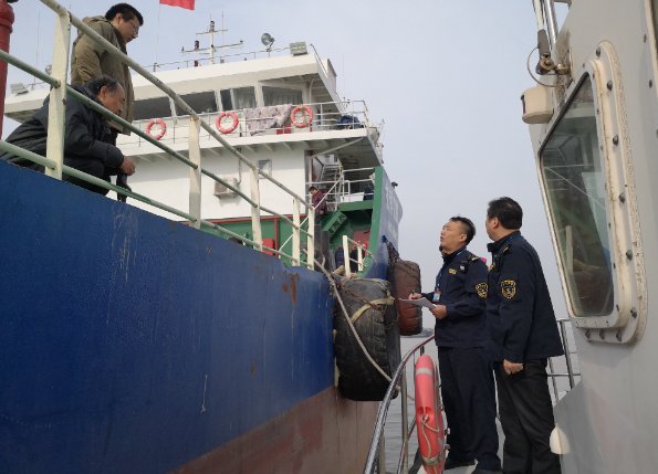 图为海事执法人员对船舶进行现场监督检查并进行恶劣天气安全提醒。(王春光 余晓强)