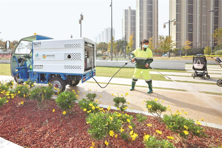 环卫工人对市区内的主要道路以机械+人工作业相结合的模式,做好机动车道、非机动车道、人行道及绿化带内的清扫作业。(敖翔 )