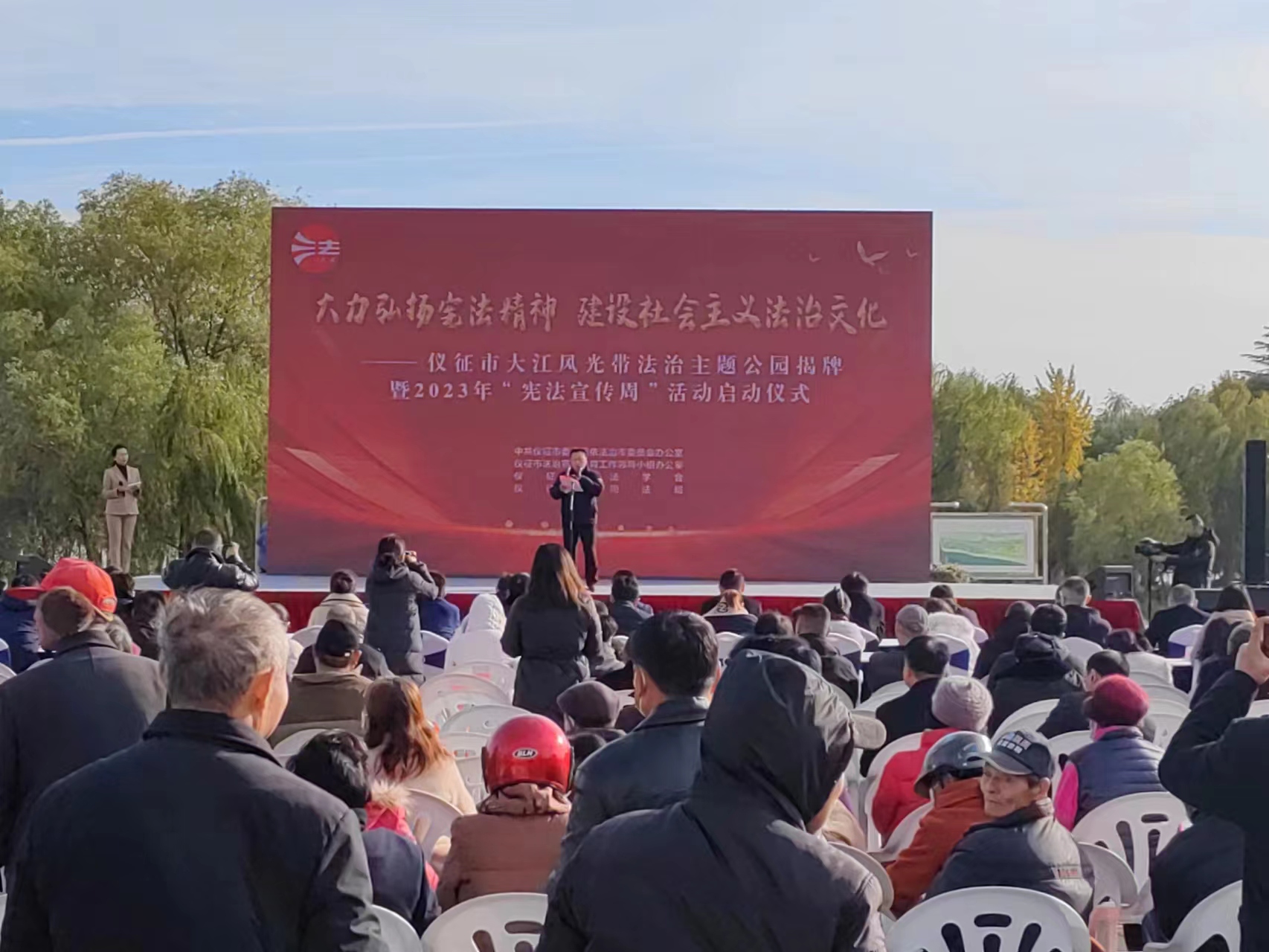 11月30日下午,仪征市在扬子江公园举办大江风光带法治主题公园揭牌仪式,并启动“宪法宣传周”活动。仪征市公检法司以及长航公安局南京分局等数十个单位,通过举办第三届法治游园会、法治主题文艺演出、综合法律咨询等活动,教育引导广大市民树立宪法意识、增强宪法观念、维护宪法权威。