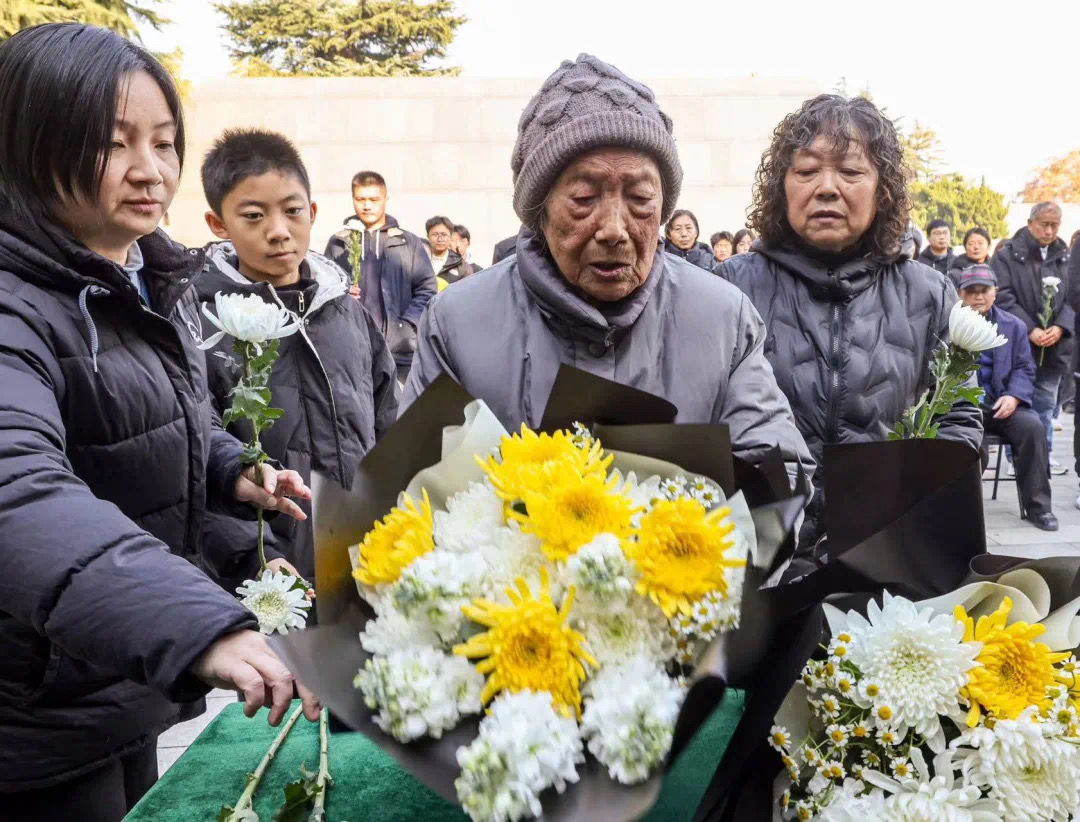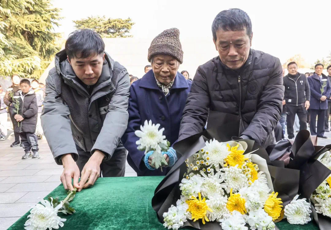 南京大屠杀幸存者艾义英、夏淑琴、刘民生手捧鲜花,在家人的搀扶下来到“哭墙”前,再一次为逝去的亲人送上鲜花和哀思。