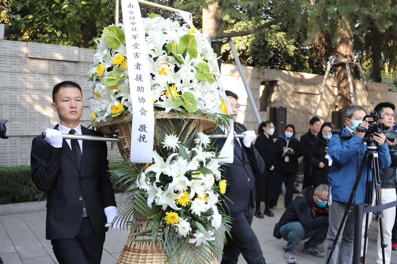 工作人员抬着祭奠花篮走向“哭墙”。人们面朝由黄白菊、松柏枝围就的“奠”字,向南京大屠杀死难者三鞠躬。