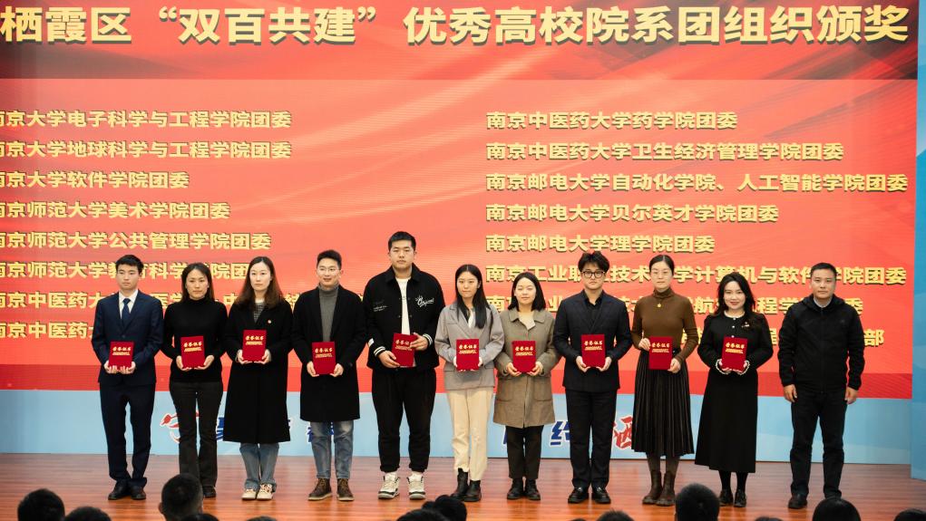 栖霞区“双百共建”项目自启动以来,得到了驻区各相关高校团委和院系团委的大力支持,截至目前已促成5所高校65个院系团组织与栖霞区9个街道45个社区(村)团组织结对,组织大学生走进基层开展文化宣传、助力安全生产、联青大走访、助农直播等各类志愿服务活动。现场为栖霞区“双百共建”优秀高校院系团组织代表颁奖,动员引领大学生深入参与基层社会治理、助力栖霞发展。