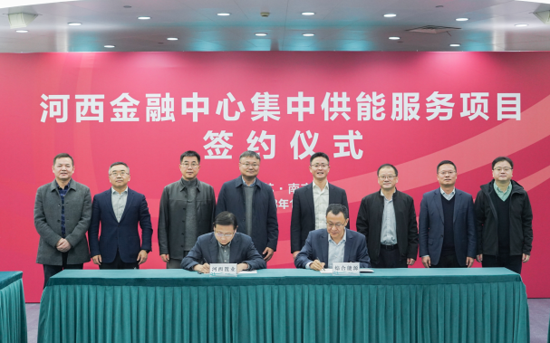 2023年12月6日,河西金融中心集中供能服务项目的签约仪式在南京举行,河西集团与国网江苏综合能源公司、国网南京供电公司合作共建河西金融中心能源站,助力绿色低碳园区建设。