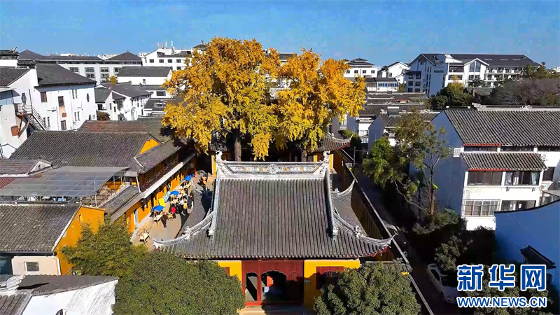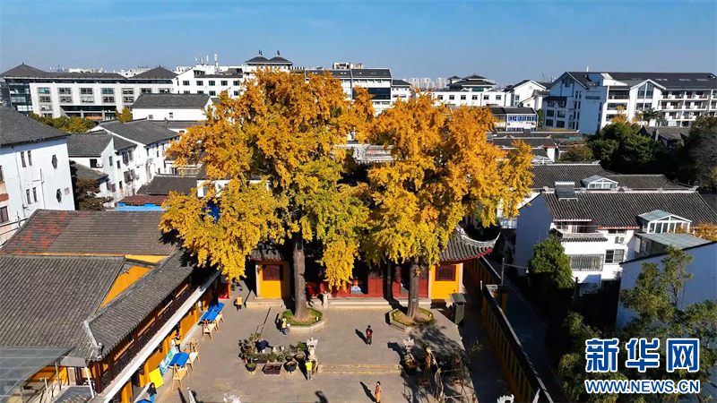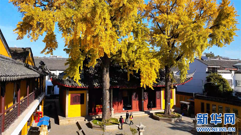 初冬时节,苏州定慧寺中的两株三百余年的银杏迎来最佳观赏期。银杏树秀丽挺拔,散发出古朴而厚重的魅力。(沙佳仪 素材来源:姑苏发布)