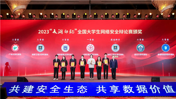 2023“太湖印记”全国大学网络安全生辩论赛是本届网络安全发展大会的重要赛事活动,已连续举办四届。上海交通大学、武汉大学、金陵科技学院、广州大学、陆军工程大学、南京邮电大学等6所高校的网络安全学院代表队伍从18支初赛队伍中脱颖而出,围绕“互联网信息服务算法”“人工智能大模型的发展”“人工智能大模型的监管”三个主题,通过唇枪舌剑、激烈角逐,最终分别获得特等奖、一等奖和二等奖,1名选手被评为最佳辩手。