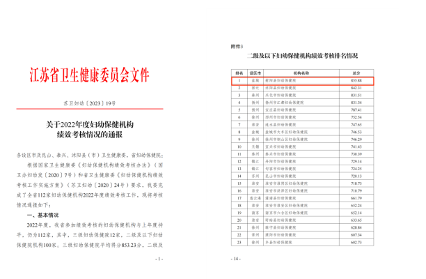 12月20日,从盐城市射阳县妇幼保健院传出喜讯,江苏省卫生健康委员会于日前印发了《关于2022年度妇幼保健机构绩效考核情况的通报》:在江苏省参加国家妇幼保健机构绩效考核的100家二级及以下机构中,射阳县妇幼保健院喜获第一名。