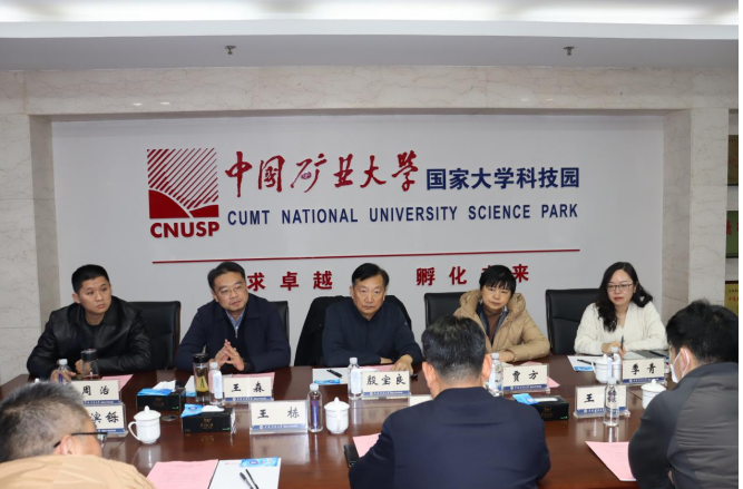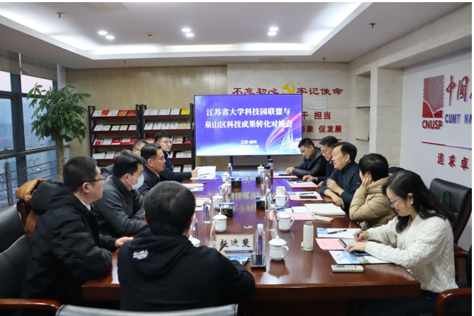 12月19日,江苏省大学科技园联盟与徐州泉山区人民政府科技成果转化对接会在中国矿业大学国家大学科技园召开。联盟理事长殷宝良、执行理事长贾方、副理事长王森、副理事长季青、副理事长周治,徐州市泉山区人民政府党组成员、副区长、科技镇长团团长王荣昌、江苏淮海科技城管委会副主任王栋、泉山区科技局副局长王璐出席会议。
