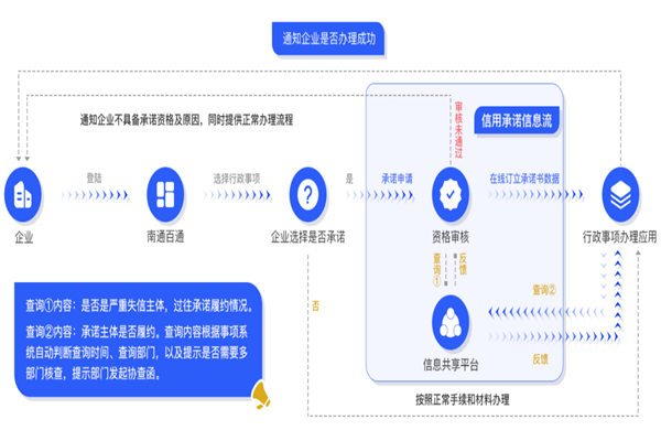 承诺前,系统自动对承诺人进行承诺准入资格判断,将准入资格与信用信息库数据比对,判断准入资格;承诺时,系统支持多种承诺渠道,承诺人可在南通百通政务APP、移动端设备和PC端网站上传信用承诺书;承诺后,相关信息将统一归集至信用信息库,承诺受理单位可在系统查询、统计相关事项的承诺记录。针对违诺记录,承诺人可申请违诺修复。