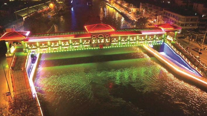 杨家湾桥流光溢彩的亮化灯光,以特有的样式和造型,与周围自然、人文环境完美融合,不仅为夜行的人提供了方便,带来充足的安全保障,还为唐闸古镇的夜空增加了一抹亮色,形成一张独具特色的“唐闸名片”,为唐闸旅游发展增添了多彩的一笔。(蒋娇娇 李宜东)
