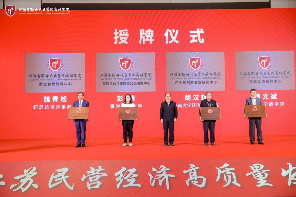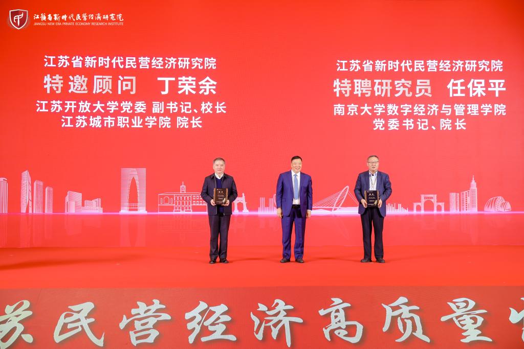 研讨会期间,江苏省新时代民营经济研究院民企合规研究中心、家族企业与家族办公室研究中心、产业与创新集群研究中心、苏商品牌研究中心举行授牌仪式;江苏开放大学党委副书记、校长、江苏城市职业学院院长丁荣余被聘为江苏省新时代民营经济研究院特邀顾问,南京大学数字经济与管理学院党委书记任保平被聘为江苏省新时代民营经济研究院特聘研究员。