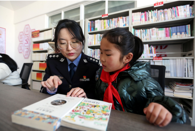 在张庄村村委阅览室,徐州东站派出所政委邢佳琪、民警曹思正带着小朋友一起读书,解答小朋友的提问,一个个文化的种子印在每一个小朋友的心里。民警还向小朋友们宣传出行安全和防诈常识,进一步增强安全意识。