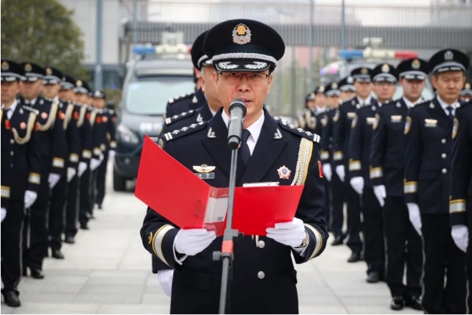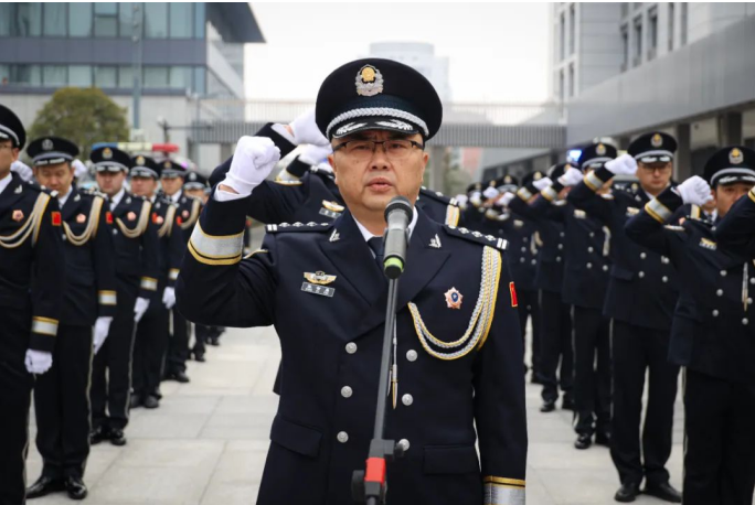在分局党委委员、副局长张智勇带领下,全体民警重温《公安机关人民警察誓词》。全体民警面向警旗,高举右手庄严宣誓,铿锵有力的誓言表达了作为一名人民警察的自豪和荣耀,展示了新时代崇川公安队伍的精气神。