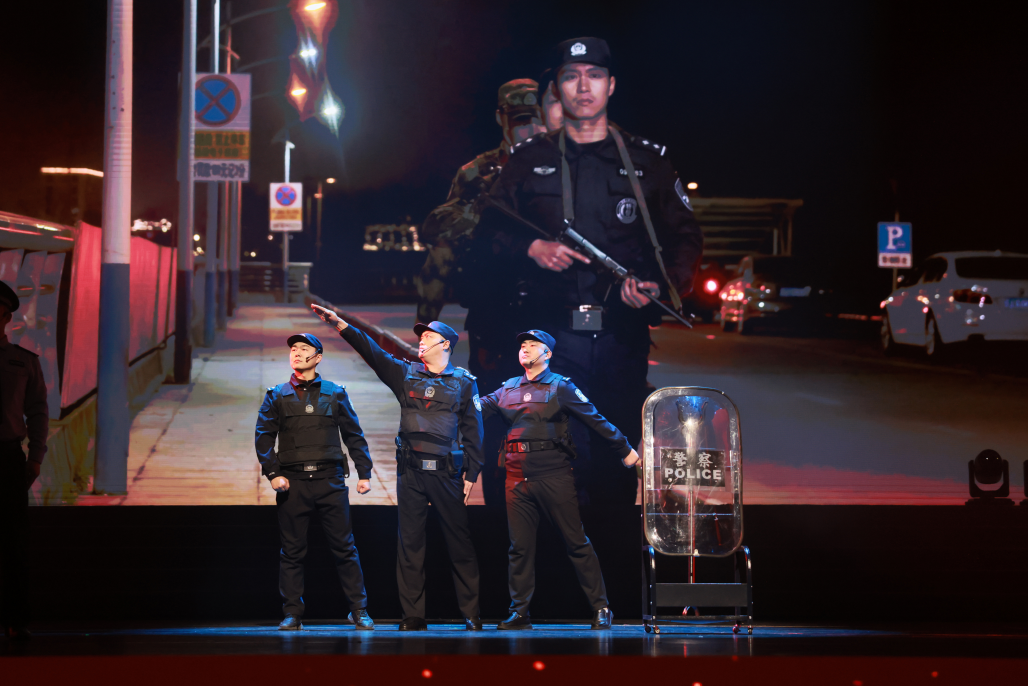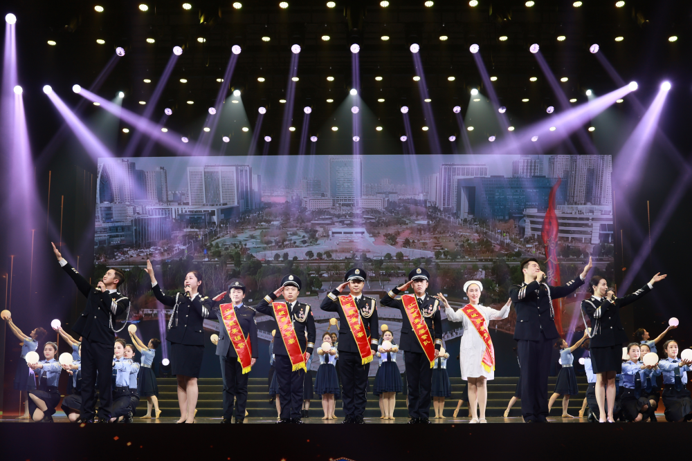 “为了人民幸福,为了复兴理想,风雨兼程,不可阻挡……”歌舞《领航》以旗叙志、以歌抒情、以舞传意,表达了盐城公安坚定不移跟党走的决心信念。