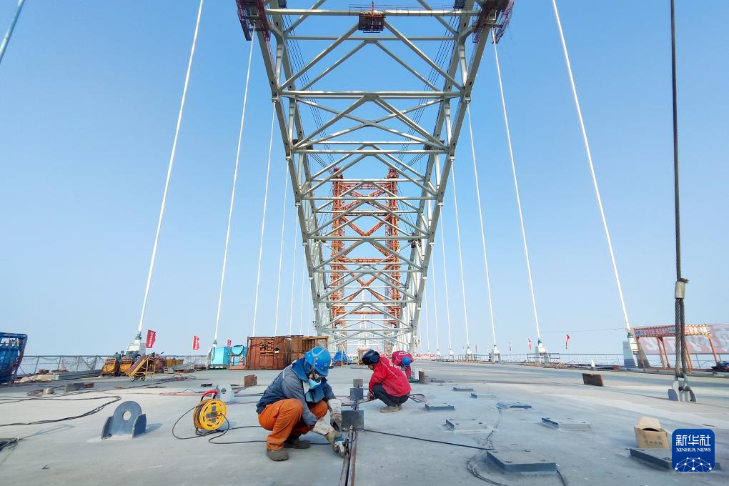 1月12日,工人在常泰长江大桥录安洲专用航道桥上施工。